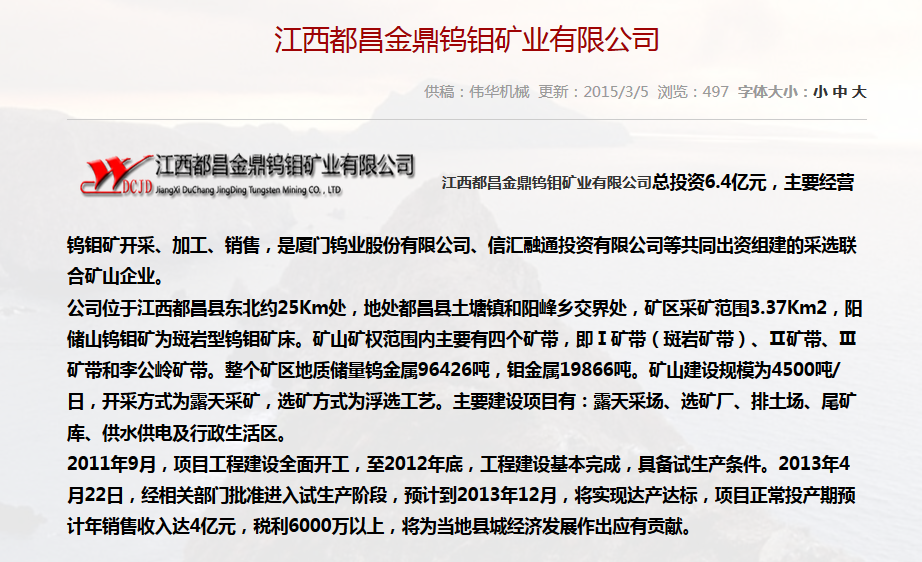 合作單位:江西都昌金鼎鎢鉬礦業(yè)有限公司
